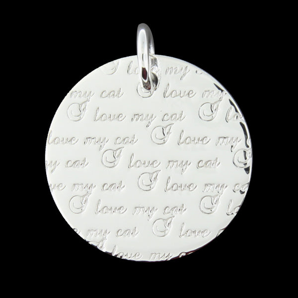 The words “I love my cat” are repeated in an elegant font on this stylish sterling silver pendant. Measures 1” (24mm) in diameter.